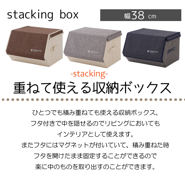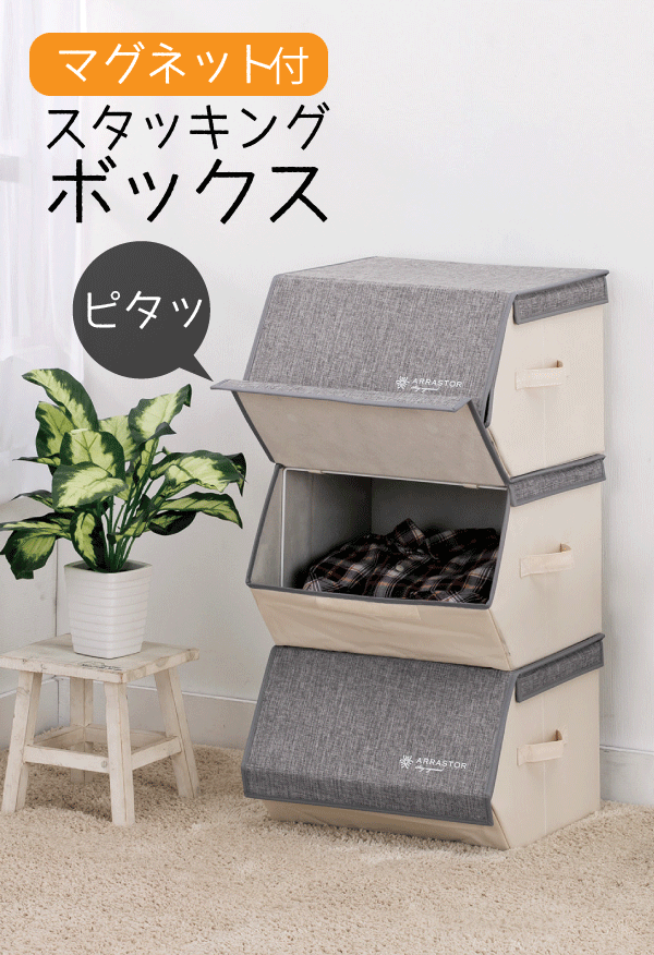 商品情報 重ねて使えて、前から出し入れ出来る便利な収納BOX ! ●麻風のファブリックがおしゃれなスタッキングボックス!●前扉に固定マグネット付きで開けたまま収納できます。