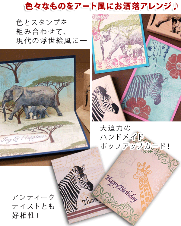 大きめサイズのスタンプなので迫力ある作品に! カード作りはもちろん、無地の袋やファブリックなど、色々なものをアート風にお洒落アレンジ出来ます♪