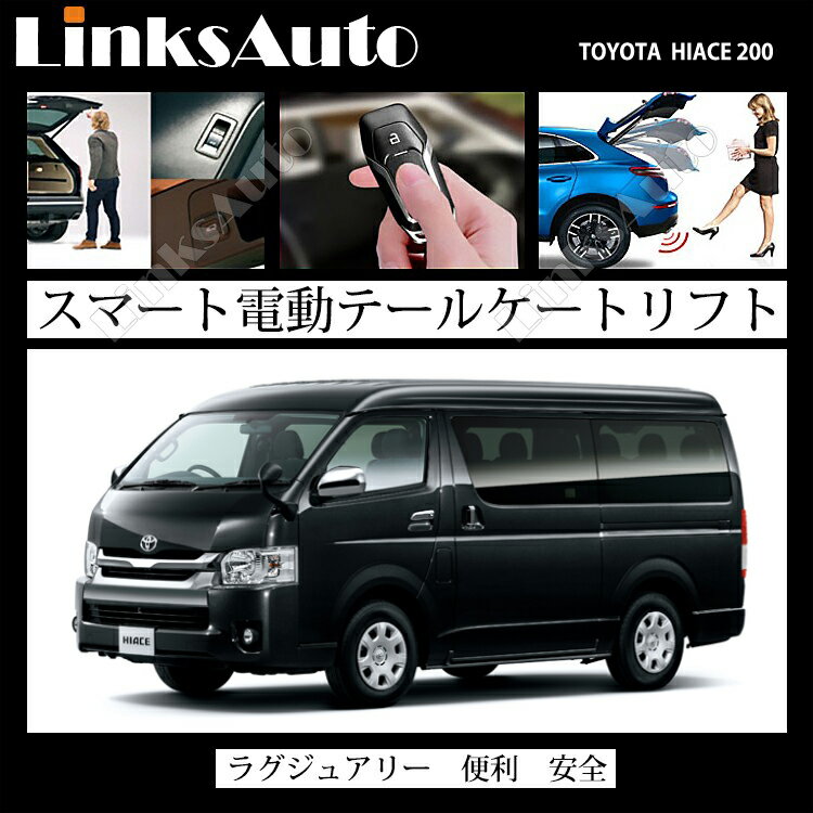TOYOTA ハイエース HIACE 200系 2010- 標準ボディ車 LinksAuto純正交換用電動バックドアキットが登場のオートテールゲート TOYOTA ハイエース HIACE 200系 2010- 標準ボディ車 後付け電動トランク! 待望の専用電動バックドアキットが登場! 商品説明 ■LinksAuto純正交換専用電動バックドアキット トヨタ 車種:HIACE 型式:200系 標準ボディ車 グレード:全グレード ■既存のトランクスイッチはもちろん バックドア、フロントに増設する2個のスイッチ 運転席集中ドアロックスイッチ、 さらに純正リモコンもそのままで操作可能! ■雨の日や荷物がいっぱいの時には大活躍! 本モデルよりカプラオン設計となったので配線を探したり 接続ミスなどに気を使うことなく専用配線を同梱しました! 1、純正リアゲート開ボタンによる開閉・ストップ 2、リアゲート専用ボタンによる開閉・ストップ 3、リモコンのアンロックボタンによる開閉 4、室内専用ボタンによる開閉 5、運転席集中ドアのアンロックボタンによる開閉 6、挟み込み時の停止機能(閉時) 7、障害物停止機能(開時) 8、ゲート開時高さ調整機能 ・調整幅(全開時より25cm前後) 9、ブザー音(作動中) 商品内容■ダンパー x2 ■ユニット x1 ■ハーネス類 ■スイッチ x2 ■専用ユニット x1 ■日本語図解入り取説 x1 ■LinksAuto ■:オプションのフットセンサーキット(9960円)取付け可能 ■※ 備考:CE,E4,ISO9001資格取得済み メーカー保証 ご購入日より6ヶ月間となります。